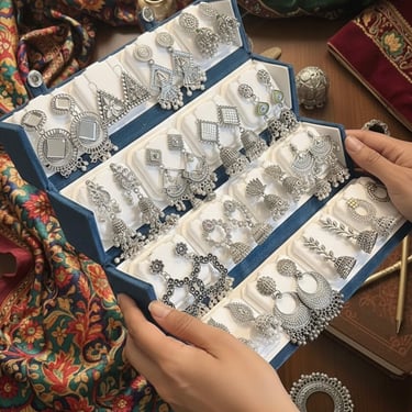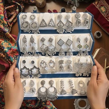 Dive into a treasure trove of sparkle with this fabulous set of 16 earrings! From delicate studs to statement jhumkas, there's a perfect pair for every mood and occasion. Each design brings its own personality to your jewelry collection, whether you're going minimalist chic or full glam. The bonus? They arrive in a gorgeous folding jhumka box that's as Instagram-worthy as the earrings themselves—perfect for gifting or keeping your collection beautifully organized. Mix, match, and slay!